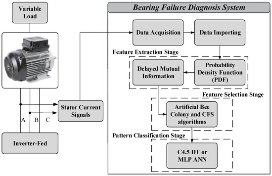 In the present work, these optimization tools can collaborate to select the most relevant attributes of the failure patterns to reduce the input matrix of the pattern classifiers. Thus, the contribution of this work consists of developing an alternative methodology for the diagnosis of bearing failures in three-phase induction motors based on the optimization of the input matrix of the pattern classifier. First, this approach selects the most relevant attributes of mutual information measurements between the signal processing stage’s current signals using the ABC algorithm. Finally, the pattern classifiers, the C4.5 decision tree (C4.5 DT) and the multi-layer artificial neural network (MLP ANN), better identify the bearing fault signatures extracted in the previous stage, are evaluated.