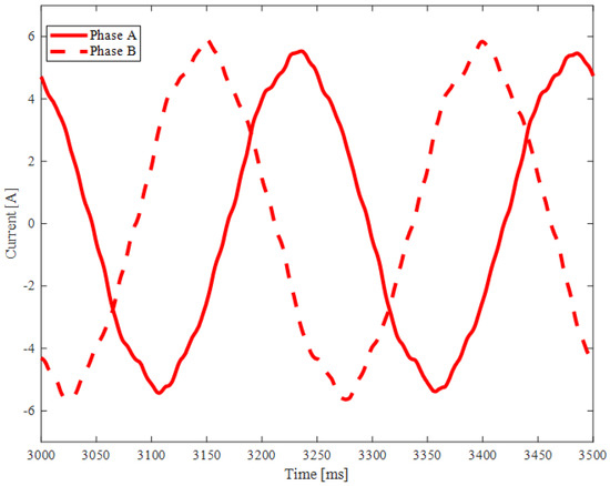 Stator current signals of Motor 1, without bearing faults, coupled load of 5 N.m. and supply frequency of 60 Hz.