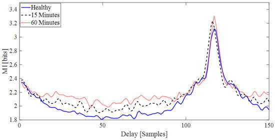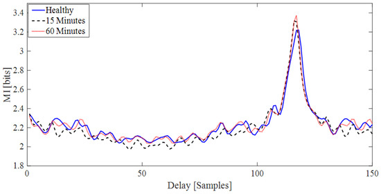 Firstly, Figure 5 was obtained for signals for Motor 1 with a supply frequency of 60 Hz and with a coupled load torque of 0.5 N.m. In this figure, it is possible to notice that the evolution of wear on the machine’s bearings causes an increase in mutual information’s maximum value. In conclusion, as the fault progresses, the peak of the DMI increases. These characteristic patterns are also similar and can be analyzed as the machine’s load torque changes. Figure 6 shows the DMI curves for Motor 1 with a supply frequency of 60 Hz and a load torque of 5.0 N.m. Again, there is a similar behavior observed in Figure 5. With the evolution of the defect, there is an increase in the maximum values of DMI signatures.