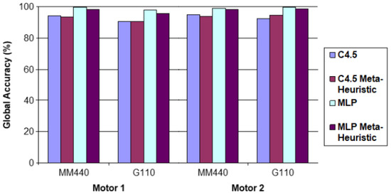 Table 4 shows that the best results are obtained with the MLP meta-heuristic classifier regardless of the inverter. When the MM440 inverter supplied Motor 2, 98.5% of the samples were correctly identified. Using the G110 as a supply source of Motor 2, the proposed method achieved a classification accuracy of 98.7% of the global samples. Kappa indexes over 0.95 confirm the full results in both situations. Moreover, when the C4.5 meta-heuristic classifiers were used in the MM440 and G110 data set, slightly lower classification rates were obtained. Kappa coefficients over 0.81 confirm the satisfactory performance of the proposed system using the C4.5 meta-heuristic classifier.