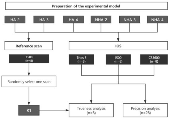 The present study aimed to determine the accuracy of intraoral scanning data and the jaw relationship between quadrant maxillary and mandibular models according to whether or not there is an HA at the implant placement site, and elucidate the distribution of distortion on the arch span when using three types of IOSs. The first null hypothesis of this study was that the accuracy of the scan data does not differ significantly between the presence or absence of an HA in a quadrant implant model. The second null hypothesis was that the distortion in the accuracy of the scan does not vary from anterior to posterior tooth positions.