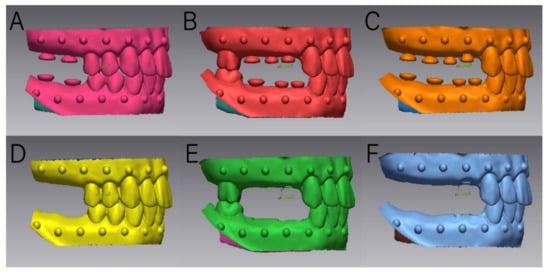 One implant was placed at each position where a tooth was missing, with each implant designed to be placed in the same position in each model. Once the implant surgical guide was designed using Implant Studio software (3Shape, Copenhagen, Denmark) and three-dimensionally printed using an SLA 3D printer (Form 3, Formlabs, Somerville, MA, USA), the implants were installed at the position of the missing teeth in each model by a single expert clinician. Since the implant positions were likely to affect the results, an implant surgical guide was used to ensure precise implant placement for each model.