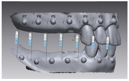Linear measurements were used in this study to illustrate the distortion of the scan relative to the tooth position and identify the area with the greatest distortion. Each scan was imported into the Geomagic Control X software, and the “resegment” function was used to divide the model into a multitude of small regions. The hemispheres on the labial/buccal side of the arch were then automatically recognized and captured by the software. The coordinate of the center point was provided by the software. The hemisphere position of the central incisor was named position 1 (P1) and the hemisphere position of the lateral incisor was named position 2 (P2). By analogy, we named the remaining hemisphere positions up to position 7 (P7) (second molar) (Figure 3). The distance between the upper and lower hemispheres was then calculated using the “linear dimension measurement” function. All of the linear distances between the upper and lower hemispheres were recorded, and the difference values (D-Values) between the measurement scan distance (MSD) (acquired by IOSs) and the reference scan distance (RSD) (acquired by the T500 scanner) were calculated using the following formula: