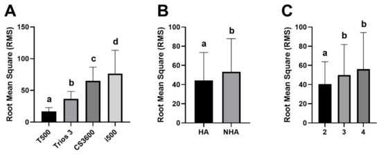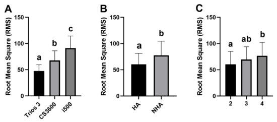 Trueness was defined based on the results obtained when superimposing the IOS and reference scans. Normality was checked using the Shapiro–Wilk test, and Levene’s test was used to assess the homogeneity of the variances for all test groups (with a significance cutoff of α = 0.05). The mean RMS value and its standard deviation were calculated and defined as trueness in the variance analysis. Three-way ANOVA, as implemented by statistical software (SPSS version 25.0, IBM, Armonk, NY, USA), was used to analyze differences of the trueness between the HA and non-HA (NHA) groups for any given scanner and location and number of missing teeth and to assess the effect of HA (α = 0.05). Tukey investigations were used for multiple comparisons. For each IOS, due to the relatively small samples, additional Bonferroni’s post hoc tests were applied for pairwise comparisons between groups.
