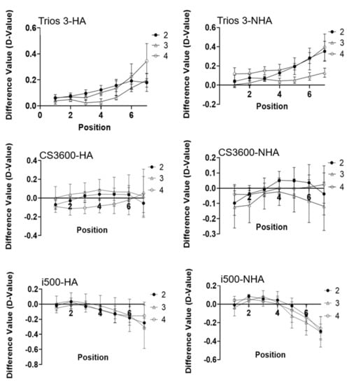 The results of the J–T trend test are summarized in Table 3. The differences between the reference and measurement scans at each tooth position for the given scanners are illustrated in Figure 6. A negative value of the Standard J–T Statistic in this case indicates that the difference decreased as the tooth position moved posteriorly, while a positive value indicates the opposite. Table 3 indicates that positive values of the Standard J–T Statistic were found for the Trios 3 IOS and negative values were found for the i500 IOS. However, most of the values for the difference were negative. The differences increased as the tooth position moved posteriorly. Therefore, a significant upward trend of distortion was also found from the anterior tooth position to the posterior tooth position for the i500 IOS. However, no significant trend was found for the CS3600 IOS.