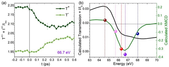 Typical transmitted intensity time traces are plotted in Figure 2a for an XUV energy of 66.7 eV and both external field directions (dark green) and (light green). As expected, the thin film is excited on sub-ps timescales; the difference between and is quickly decreasing after , which reflects the strong transient modifications of the magnetic properties of the system.