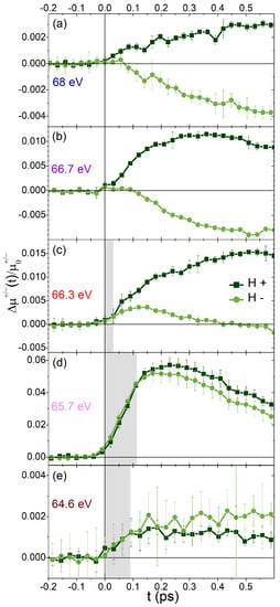 Figure 3 shows the relative absorption for both field directions, obtained using 5 different XUV wavelengths. For all these probing energies, we observe an increase of the relative absorption for majority electrons (, dark green), while the relative minority electron absorption (, light green) increases for 64.6, 65.7 and 66.3 eV and decreases for 66.7 and 68 eV. Thus, the evolution of the minority electron (, light green) absorption with time (and, to a lesser extent, the majority electron adsorption) depends on the probing energy. Note that these changes result from a modification of available states before and after optical excitation. For probing energies below the Fermi level (66.2 eV for Ni [44]) the absorption increase corresponds for example to a depletion of electrons (i.e., more free states available), similarly, for probing energies above the Fermi level (namely 66.7 eV and 68 eV), a decrease of absorption indicates that the initial free states are now occupied by excited electrons. In addition, Figure 3 shows that transient absorption changes for different applied fields do not systematically start at : the same dynamics are observed for both field directions during the first tens of fs after optical excitation for E = 64.6, 65.7, and 66.3 eV (highlighted grey regions). At first glance, this is in line with the recent observation of a delay between ultrafast electronic and magnetic dynamics [30,34]. For eV, a closer look at the first 100 fs reveals a crossing between and curves. As we will explain in the discussion section, we believe that this is the signature of a MCD spectrum shift.