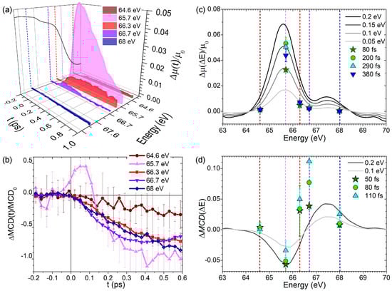 A comparison of the calculated with our experimental data, Figure 4d, also provides support for a shift of the MCD. Note that since the MCD is inferior to 0, a negative value of corresponds to an increase in magnetization. Therefore, we can interpret the observed increase in the magnetization shortly after ( eV, magenta data in panel (b)), as well as the small delays between and the onset of the demagnetization process ( eV and, to a lesser extent, eV) as resulting from a redshift of the MCD. This increase in the magnetization competes with the usual ultrafast demagnetization, and is visible only briefly after . Note that this explanation could provide additional insight into a recent study where an increase of the Ni magnetization on early timescales, in an FeNi alloy, has been attributed to optically induced spin transfer effects [44]. Furthermore, it is in agreement with the theoretical calculation of Carva et al. [24]. For 100 fs the magnetization quenching dominates, irrespective of the energy. For probing energies where the aforementioned electronic redistribution and ultrafast demagnetization channels do not compete (66.7 end 68 eV), we do not find any lag between the onset of the electronic and magnetic dynamics (Figure 3a,b). The increase and delay in the magnetic response briefly after thus unravel a subtle interplay between electronic and spin dynamics. Indeed, this highlights that the electronic population dynamics are spin-dependent and that ultrafast demagnetization is intimately linked to the change in density of states close to the Fermi level as previously observed in photoelectron experiments [26,36].