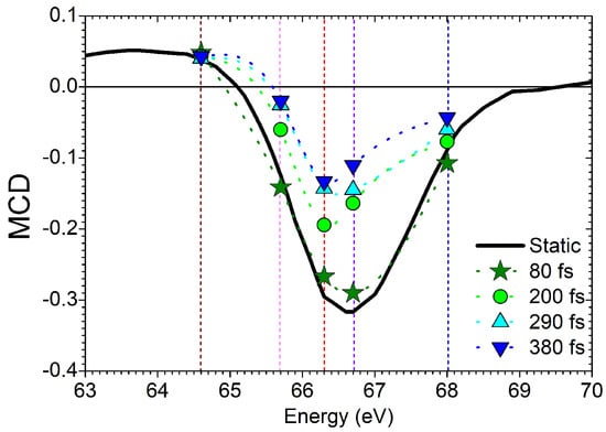 The redshift of the MCD should also be explicitly observed when plotting the MCD as a function of the photon energy for different delays. Even though we were not able to measure the full spectra, but only five energies, as shown in Figure 5, we indeed find evidence for a slight shift of the static MCD spectrum (black curve) towards smaller energies for fs (green stars). On longer timescales, however, the MCD magnitude decreases and we observe a distortion of the spectra, especially for higher energies. We emphasize that these results are not at odds with data presented recently by Stamm et al. [31]. In fact, their measurements on Ni are performed 0.7 ps after the excitation, which is well beyond the typical time where MCD energy shifts can be observed, as shown in the present study. However, this recent work of Stamm et al. [31] demonstrates that it is now possible to measure full MCD spectra for different delays.