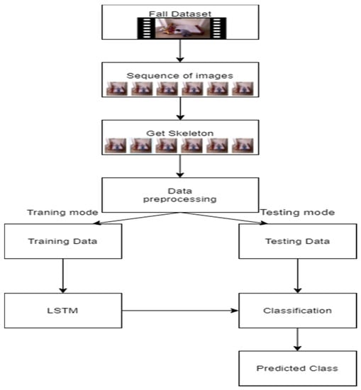 This paper proposes a fall detection framework based on OpenPose′s long short-term memory (LSTM) and gated recurrent unit (GRU) model. The proposed method reduces equipment costs, and does not require a user to wear sensors or the use of specific photography equipment. The framework has a short training time and protects user’s privacy. The proposed framework adopts linear interpolation to compensate for the joint points loss and a relative position normalization method to improve the efficiency of the machine-learning algorithm and detection accuracy. The remainder of the paper is organized as follows: Section 2 introduces the proposed system architecture and methodology. Section 3 presents the evaluation of the proposed framework and experimental results. Section 4 provides a discussion on the interpolation approach for missing data recovery. Section 5 concludes the paper.