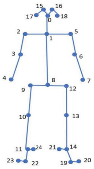 As shown in Figure 3, there are 25 joint points in the human body estimated by OpenPose, with Point 0 indicating the nose, 15~18, the right and left eyes and ears, 1, the neck, 2~7, the right and left shoulders, elbows and wrists, 8, the center of the hip, 9~14, the right and left hips, knees and ankles, and 19~24, the left and right soles, toes and heels.