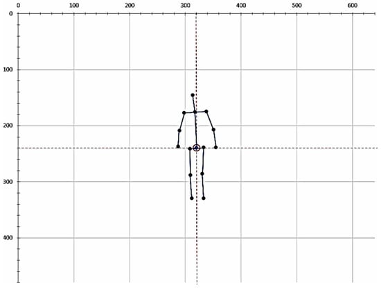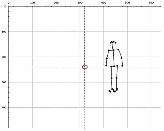 As shown in Figure 5, we unify the image size to 640 × 480 pixel and set a center point. After displacement by the above formula, as shown in Figure 6, the human skeleton will be moved to the center of the image and the central hip joint point will be equal to the center point position. In the skeleton diagram of fall and non-fall activities, we found that some joint points are not important for the recognition of fall events, so we remove them. Too many feature parameters may also cause the recognition rate to decrease or complicate the environment. Only 15 important points are retained as training feature values, among which the joint points of nose, shoulders, elbows, wrists, neck, hip, knees and ankles are retained.