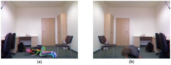 The UR Fall Detection Dataset is produced by the Interdisciplinary Center for Computational Modeling of Rzeszow University. The content contains 70 (30 falls and 40 activities of daily living) sequences at a rate of 30 frames per second. Both fall events and other daily living activities such as standing, squatting down to pick up objects, and lying down were recorded. The environment has sufficient lighting. Two Microsoft Kinect cameras were used to record the fall event with the corresponding accelerometer data. The fall events were recorded with two cameras, and only one camera and an accelerometer were used for recording daily activities. As shown in Figure 2a, the height of the device is around the waist of a human body, and the image size is 640 × 480. We group these image sequences into a group of 100, and after data enhancement, there are 792 groups in total.
