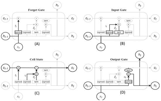Long short-term memory (LSTM) [31]. (A) Forget Gate; (B) Input Gate; (C) Cell State; (D) Output Gate.