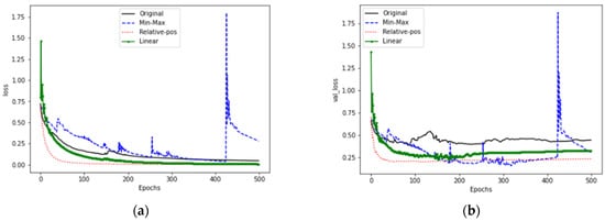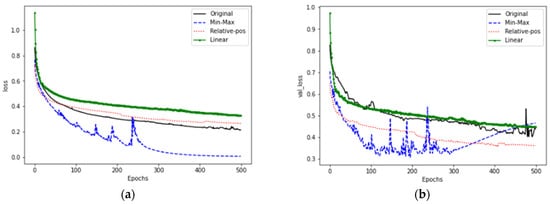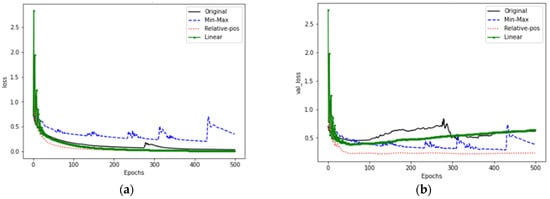 Figure 16 shows the training and verification loss for LSTM. Figure 16a is the training loss. The structure of LSTM improves the long-term memory compared to RNN, so it has better performance. The relative position normalization method converges at Epochs 50, while for linear interpolation and the relative position method, convergence is at Epochs 250, and the loss error is reduced to less than 0.25. For the maximum and minimum, the training loss jumps up at Epochs 420. The reason for this is also that the training data distribution is damaged. Figure 16b is the verification loss. It shows that the proposed method using linear interpolation suffers from over-fitting because the structure or learning parameters are inappropriate.