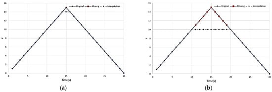 Linear interpolation to compensate for missing points. (a) Point 15 (turning point) is missing; (b) Points 11–19 (including turning points) are missing.