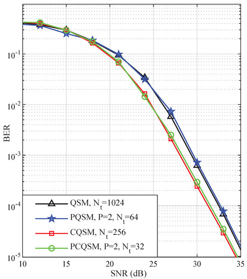 - For the same number of transmit antennas, the PCQSM uses lower modulation order, and therefore achieves better bit error rate (BER) performance. Compared to the PQSM, our proposed scheme has a signal-to-noise ratio (SNR) gain of 4 dB, while using two and four subgroups.