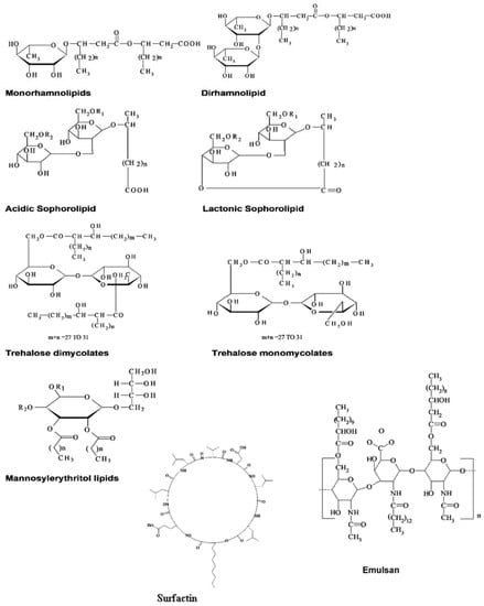 - Naughton, P.J.; Marchant, R.; Naughton, V.; Banat, I.M. Microbial Biosurfactants: Current trends and applications in Agricultural and Biomedical industries. J. Appl. Microbiol. 2019, 127, 12–28. [Google Scholar] [CrossRef]