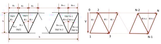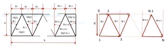 The basic module on which the appropriate combination that represents the initial profile of the section of the part will be established is formed by three TRZ, and is considered under the modular approach (Figure 3a). The basic module will respond in the evolution of the fluence of the material contained in it with the determination of an output velocity of the module from the input velocity and geometric characteristics. This evolution can be observed in its corresponding hodograph (Figure 3b).