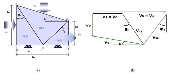 Being a basic module, it must have a general character, so it is necessary that it be defined with all the forces and speeds susceptible to occurrence, that is, input and vertical velocities, and also have the possibility of the previous module, in the case that it exists. This previous module would be fixed on the vertical plane of symmetry (if it is an initial module, the input velocity will be zero and will cancel out everything that is associated with it). This is why the denomination of zones has been used as 4, 5, and 6. (TRZ1, TRZ2, and TRZ3 would correspond to the initial modulus, arranged on the plane that delimits the flow of the material). The position of the lower vertex of the TRZ5 is not fixed in a first analysis and, therefore, the parameter x2 appears.