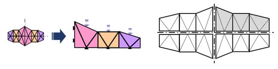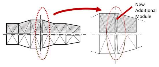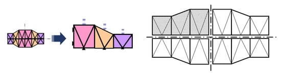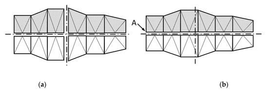 After establishing the new symmetry plane, this one intersects one of the modules, so the new resultant configuration has a new additional module of 0.778 in width on the right side of the profile (Figure 10). Now, two new geometric configurations will be generated, situated on the left (configuration 1ws) and on the right (configuration 2ws) with respect to the new yield plane.