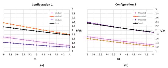 The calculation of the ratio P/2k combining the influence of both modules (PA+B/2k) is determined by Equation (17), where some weight factors are included, considering the geometry of each module by means of the width.