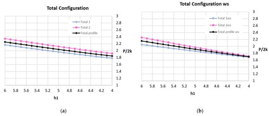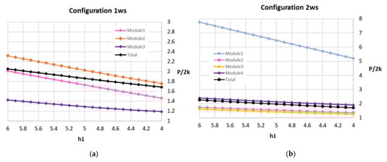 It can be seen how the value of the P/2k ratio decreases in the new configurations with the appearance of the new flow plane and the extra module. For example, for a reduction in height up to the value of 6, the values of these relationships in the initial configuration 1 and 2 are 2.166 and 2.346, respectively (Table 1 and Table 2), while, with the new redistribution and appearance of a fourth module, in configuration 2ws the resulting values are 2.053 and 2.259 (Table 3 and Table 4), with reductions of 0.113 and 0.087 between the initial and final values of our analysis.