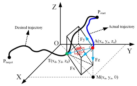 The diagram scheme of the impedance control; the black curve is the desired trajectory, while the blue curve is the actual trajectory.