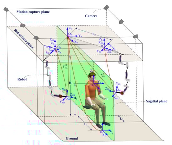 The kinematic model of the upper limb rehabilitation robot is mainly used to describe the mapping relationship of the handle to the world coordinate system during rehabilitation training. The intersection of the axes of joints, 1, is chosen as the origin of the global coordinate system, and the detailed relationship between the global coordinate system, robot coordinate system, and handle coordinate system is shown in Figure 3, where and are the handle frame and base frame of the left manipulator, respectively, and are the handle frame and base frame of the right manipulator, respectively, and is the global frame. The manipulator coordinate frames, the Denavit and Hartenberg (DH) parameters, and the kinematics equation of the manipulator are described in detail in the author’s previous works [38,39]. Take the right arm for example, the mapping relationship of the hand to the global coordinate system can be established: