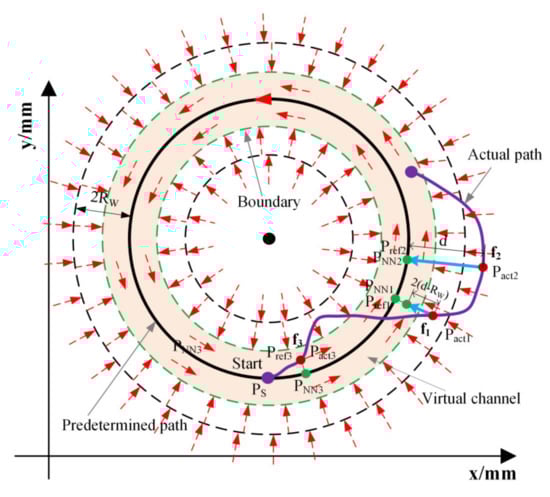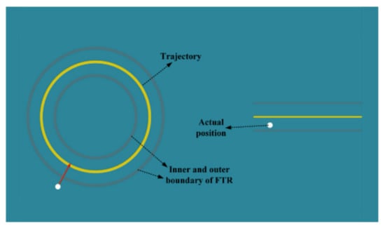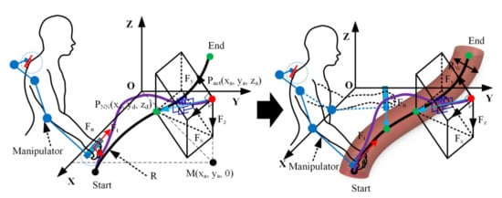 As shown in Figure 6, the red dashed line is the boundary of the FTR. When the patient’s arm is moving inside the FTR, the reference point at this time is the actual point itself—for example, the point in Figure 6. When the patient’s hand deviates from the FTR but does not exceed , the reference point is calculated by Equation (12), such as the point in Figure 6. When the deviation of the patient’s arm from the FTR exceeds the radius , the reference point at this time is the nearest point on the predetermined trajectory, such as the point in Figure 6. Finally, when the patient’s hand is at the end of the trajectory , the reference point is the endpoint of the trajectory, such as the point in Figure 6. For any trajectory , the distance between current position and the nearest position should be greater than the radius of curvature of on the trajectory: