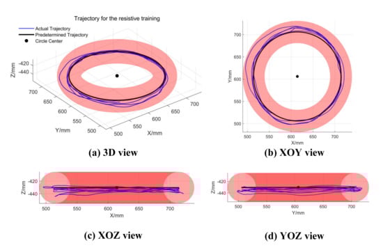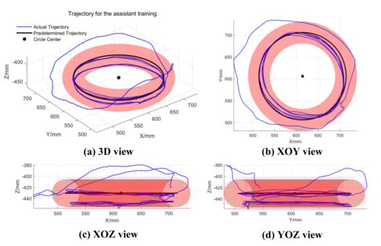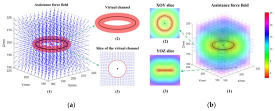 Therefore, once given the arbitrary training trajectory , a controllable assistance force field around the predetermined trajectory will be constructed. The distribution diagram of the assistance force field is shown in Figure 7a,b.