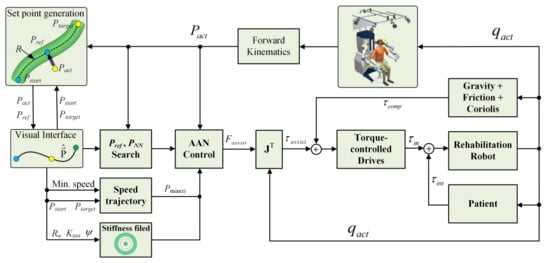 Regarding robot-aided training with the AAN characteristic, impedance control is often applied to assist patients during robot-aided rehabilitation training tasks [20]—the schematic diagram is shown in Figure 1. Clinical studies on stroke patients [21,22] showed that rehabilitation robots with the impedance control strategy have a better effect on reducing the upper limb muscle strength and improving the motor function of patients than robot-assisted therapy that simply mimics traditional therapy [23,24,25]. Although the impedance control strategy allows a patient’s arm to deviate from the training trajectory, the patient’s spatial freedom is limited. Assistance from the robot is always given as a restoring force to assist the patients once they are deviating from the planned trajectory. Therefore, scholars have developed an impedance-based AAN strategy to increase the patient’s freedom, which can be mainly divided into two categories: the band-type controller and the window-type controller. The window-type controller defines a predetermined trajectory and a moving window that allows the patient’s arm to move freely. When the patient’s arm lies outside the moving window, the patient’s arm would be corrected into the moving window by the robot’s assistance force [26,27]. Another band-type controller is based on the fault-tolerant region (FTR), which constructs a fault-tolerant band that allows the patient to move freely by establishing the inner and outer boundary of the FTR. The patient’s spatial freedom is limited in the window-type AAN controller, while the band-type AAN controller allows the patient to have complete freedom and choose his/her own trajectory without being assisted by the robot. The patient’s arm has complete freedom when moving in the FTR, while the robot will apply an assistance force to assist the patient’s arm to finish the rehabilitation training task when deviating from FTR. Research studies have also been conducted to explore increasing the patient’s freedom. Ying et al. [28] first developed a rope-driven exoskeleton rehabilitation robot and then added a fault-tolerant area around the predetermined trajectory to increase the patient’s spatial freedom. Hamed et al. [29] validated the feasibility by adding a plane channel around the predetermined trajectory based on a two-link rehabilitation robot. Although the band-type AAN controller has shown positive results in clinical trials, its tendency or ‘‘slacking’’ for the patient to rely heavily on the assistance force has been recorded [30]. The robot will not apply any assistance or correction as long as the patient’s arm is moving within the FTR, which will greatly reduce the active participation of patients. A velocity curve could be added in the FTR which will build a virtual movement in the FTR. When the patient’s arm is stagnant or moving too slowly in the FTR, the controller will generate a moving wall to push the patient’s arm to catch up with the virtual movement to complete the training task and avoid the slacking.