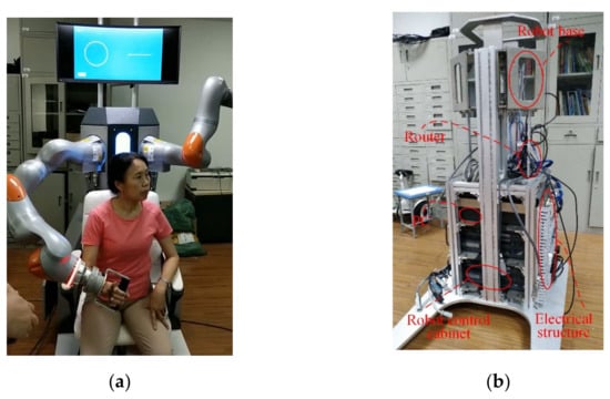 The subject testing and the detail structure of the rehabilitation robot. (a) The experimental testing with the subject and (b) the internal structure of the rehabilitation robot prototype.