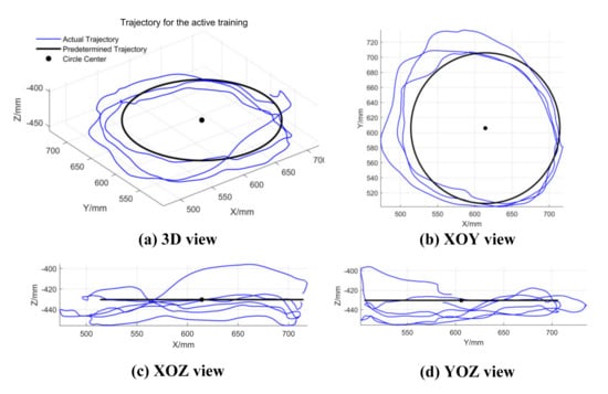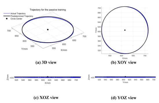 Passive training is mainly used in the early rehabilitation stage for patients with motor dysfunction. The patient does not have motor ability and the robot dominates the whole rehabilitation training process. The robot drives the patient’s arm to accurately track the rehabilitation trajectory. The subject’s arm was fixed by a bandage to the handle, and the subject was required to be relaxed during the passive training testing; then, the subject’s arm was guided by the robot to perform rehabilitation training on the circle trajectory. The testing tasks were performed, and the moving direction was counterclockwise with three turns. The Unity scene provides the subject with visual guidance and records the number of turns of movement. The parameters of the controller were = 0 mm, = [5000, 5000, 5000] N/m, = [5000, 5000, 5000] N/m, = [5000, 5000, 5000] N/m, and = [5000, 5000, 5000] N/m.