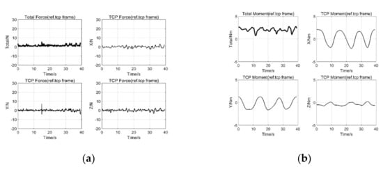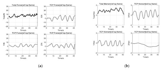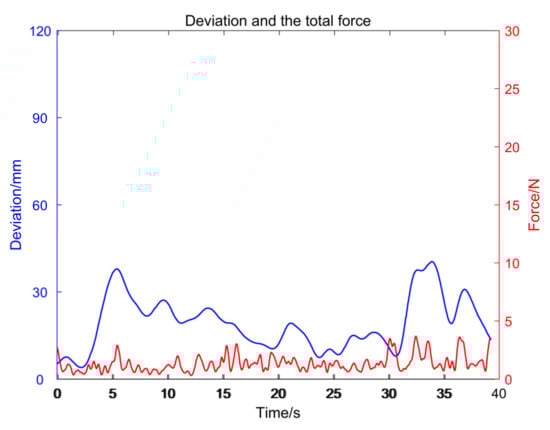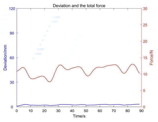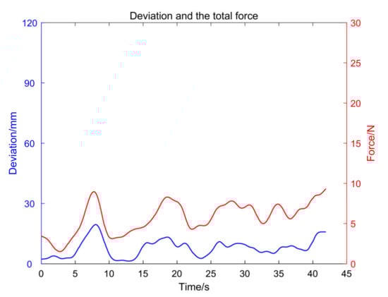 Figure 11 shows the trajectory of the subject’s arm, in which the blue curve is the actual trajectory of the patient’s hand and the black curve is the predetermined trajectory. Figure 12 shows the filtered interaction force and wrench between the robot and the subject’s hand, and Figure 13 shows the filtered deviation between the subject’s trajectory and the predetermined trajectory, as well as the total interactive force between the subject’s hand and the handle. As can be seen from the experimental results, the robot guided the subject’s hand to move along the predetermined trajectory accurately, and the root mean square (RMS) of the deviation between the actual trajectory of the subject’s hand and the predetermined trajectory is 2.44 mm. The RMS of the interaction force between the subject’s hand and the robot is 11.14 N, as shown in Figure 12a. In addition, the RMS of the interaction wrench between the subject’s hand and the handle is 2.24 Nm, owing to the fixed robot pose. The results in Figure 13 show that the deviation of the subject’s hand is quite small, which means the robot could drive the subject’s hand to track the predetermined trajectory accurately.