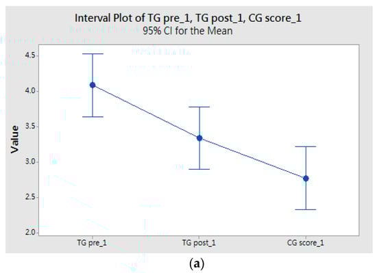 One-way ANOVA interval plot of TG pre, TG post, and CG score.