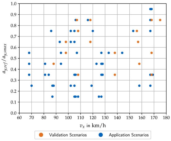 over the event duration to use only the longest event per bin with the final duration . In addition, we manually reduce the number of events by selecting individual bins that excel with a high event length and a good coverage of the entire scenario space. A coverage-based design of validation scenarios can be seen in Figure 4. The coordinates of the scenario points result from the final tenth step that represents each selected bin with its coordinate center. The distribution of points results from the availability of curves in the used segments of the German roads A7 and B19 and will be discussed in the results section in more detail. An exemplary scenario is projected on the corresponding road section in Figure 5. Each validation scenario will be repeated several times to get information about the reproducibility of the real and virtual (hybrid) experiments and to be able to apply statistical validation metrics. According to [24], we will generally use at least three repetitions if possible and ten to fifteen repetitions for individual scenarios for a detailed analysis.