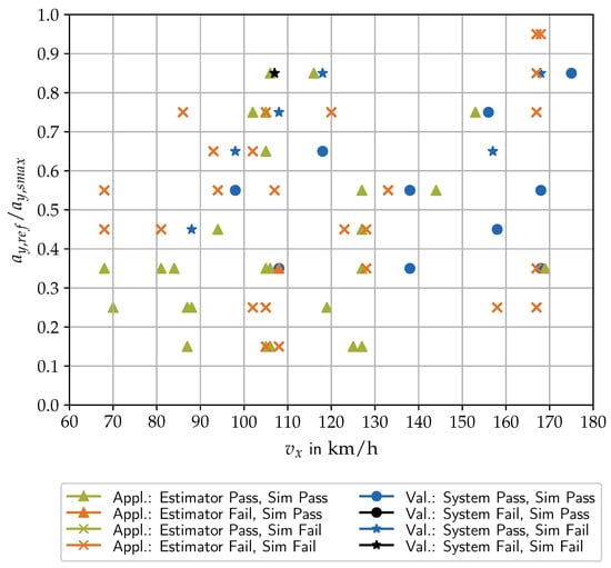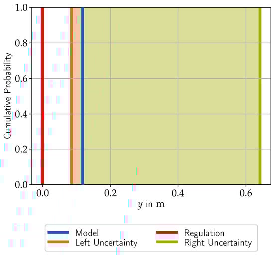 The type-approval decision making is shown in Figure 7 for an exemplary application scenario. Both the nominal simulation and the one including the modeling errors are passing the regulation threshold of zero distance to line. However, in many cases the distance to line of the simulation is relatively small. Figure 11 contains the binary pass/fail decisions across all data-driven application scenarios. In 30 out of the 62 scenarios the simulation passes the type approval, in 32 out of the 62 it fails. Since the left modeling errors—relevant from the safety perspective—were negligibly small, the decisions of the nominal simulation and the one including the uncertainties are identical for all scenarios except one. The passed scenarios show that the lane-keeping assist successfully masters many situations in this complex test environment. Nevertheless, from a safety perspective, there is a big gap left to master all situations.