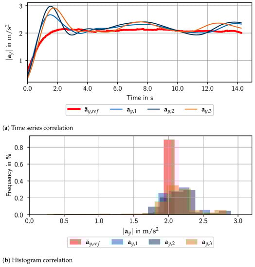 Correlation analysis with (a) time series and (b) derived histogram data (15 bins). On the one hand, both subplots contain the lateral acceleration signals of three repetitions. On the other hand, they contain the averaged reference lateral acceleration signal , as the three repetitions almost coincide. The peaks at the beginning of the signals are caused by the transient passage between the straight line and the curve entrance at the validation scenario and .