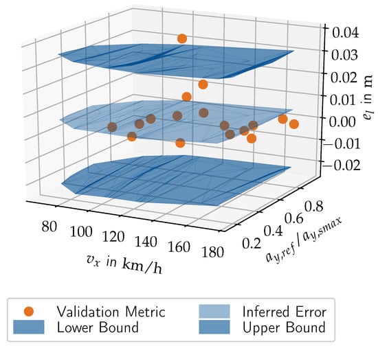 The left errors are used to parameterize the corresponding left linear regression model. It is visualized as the central response surface in Figure 10 across the entire application space. It reflects the horizontal trend of the left error points. It is certainly not possible and desired to match all points exactly, since they include some scatter. Therefore, we introduced the prediction intervals that cover the uncertainties of regression and prediction to the unseen application scenarios. These intervals are visualized as additional response surfaces for a statistical confidence of . They manage to bound the error points for all validation scenarios except one. In the case of the visualized small left errors, the effect is almost negligible. However, in the case of the larger right errors with significant scattering, the prediction uncertainty adds on average another resulting in a range between 0.3 –0.5 .