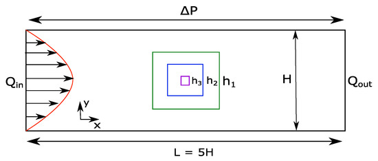 In this paper, we evaluate the pressure driven flow of rarefied nitrogen gas in a micro-channel. This is a Cartesian 2D planar setup with the flow along the x-direction. A stationary square-shaped particle is placed at the center of the micro-channel. We consider three different configurations, given by particle blockage ratios (or where H and h are the micro-channel and particle heights, respectively) 8, 4 and 2, which represent progressively increasing degree of channel obstruction (see Figure 1). The channel length (L) is five times its height (H), which is is 0.4 μm, to ensure that a fully developed flow with minimal entrance effects can be realized. The pressure drop () across the channel is varied so as to reasonably span over the entire range. Such a fundamental setup is chosen since it perfectly mimics the flow configuration studied in [5,35,36] and is well suited to describe the Knudsen paradox in micro-channels.