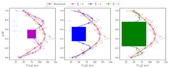 Comparison of the variations in co-axial velocity in the transition regime ( = 0.1) along channel height H at the center of the channel across the chosen blockage ratios of 8, 4 and 2, respectively, with the benchmark case without a particle (represented by the dashed line with squares). In this figure, the square particle is used as an illustrative tool to mask the discontinuities in the region occupied by the particle. The open symbols represent the DSMC data, while the dashed lines represent the weighted least squares fit.