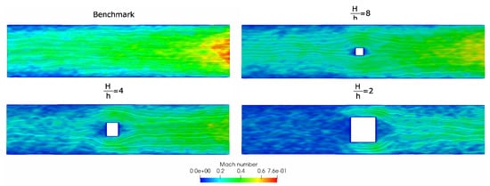 Contours of Mach number (), overlaid with velocity streamlines (colored by ), along an plane for the benchmark case (see Table 1) and the DSMC simulations at blockage ratios of 8, 4 and 2, respectively.