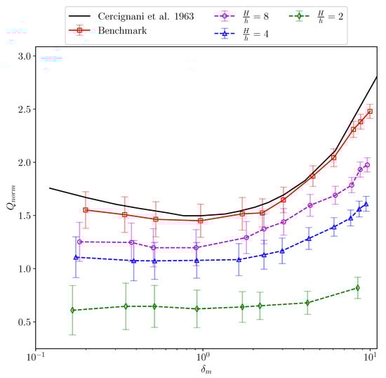where L, H and w are the length, height and width of the micro-channel, respectively. Further, R and T are the specific gas constant and iso-thermal temperature of the gas. The variable is the mass flux extracted by the solver (using the mass flux measurement tool described in [34]) and and are the inlet and outlet pressures. Note that is independent of the local pressure gradient (depends only on its mean value), but depends mainly on the channel height represented in terms of a rarefaction parameter (i.e., on an inverse Knudsen number—) [41] given by: