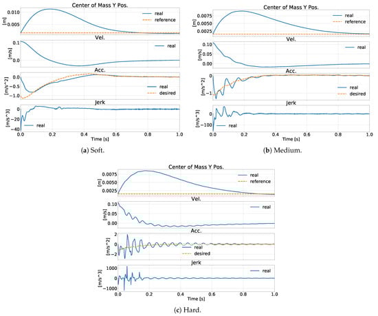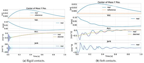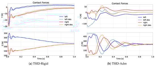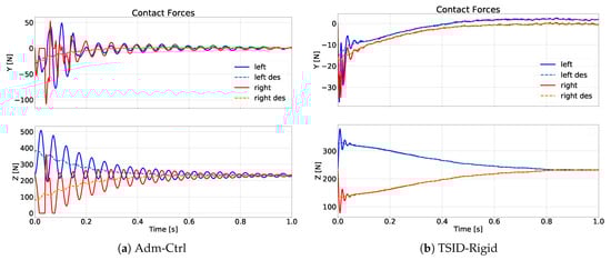 The most common approach is to neglect elasticity in the balance controller and simply assume that contacts are rigid. This method works fine for contacts that are not too soft and that are sufficiently well damped, as was demonstrated with a passivity-based controller on the Toro humanoid robot []. However, in general, making this hypothesis results in destabilizing oscillations []. Force feedback can then be used for damping these oscillations. This is usually done by using force feedback to modify the position references given to a high-gain joint position controller, leading to admittance-control schemes [,,]. Although this approach proved to be successful in practice, its lack of theoretical foundations makes it challenging to tune and analyze in a robust and repeatable way.