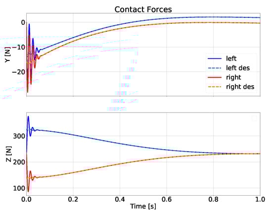 A classic way to control the contact wrenches in case of flexible contacts is to rely on admittance control. Several versions of admittance control exist and have been shown to perform well on real humanoid robots [,,,]. We decided to use the version with the minimum number of gains to simplify the gain-tuning procedure.