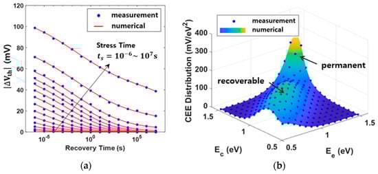 Threshold voltage shifts and capture-emission energy (CEE) map. (a) Numerical data with measured data of . (b) Comparison of numerical data with measured data of CEE map.