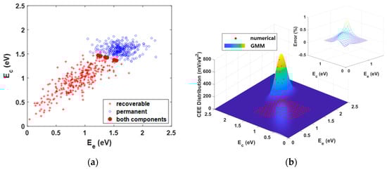 The capture-emission process of charge carriers is consistent with non-radiative multi-phonon theory based on linear electron–phonon coupling []. In this theory, the capture-emission times are expressed as where is the temperature-independent pre-factor, is the Boltzmann constant, is the temperature, and and are the capture and emission activation energy, respectively. The NBTI-induced threshold voltage shifts is related to the capture-emission processes of individual defects with a broad distribution of characteristic times. The step height observed in for small-area devices is due to individual defects, while for large-area devices similar defects are grouped together using a suitable distribution of defects [,]. This distribution is visualized in the CEE map, which can be directly obtained from experimental recovery curves of for various stress conditions by using []. The defect density map is represented in agreement with bivariate Gaussian distribution, describing the permanent and recoverable components. In the activation energy space, the density is constructed by the joint probability density function [,,,]