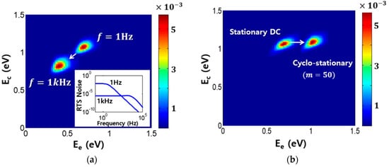 To investigate how the trap distribution influences RTS noise, the integrand of for the recoverable component in (7) is numerically calculated and visualized as a function of and under stationary DC condition at a particular frequency. It is shown in Figure 3a that a peak is distinct at and for , and moves to relatively low activation energies and as the frequency increases to . As illustrated in the inset of Figure 3a, these results arise from different RTSs, indicating that faster components of shallow trap states for are situated close to lower activation energies []. To examine the behavior of cyclo-stationary RTS, the times are modeled as and , where the factor is assumed to be greater than one [,]. In the off state, and are multiplied and divided by , as they increase and decrease with a decrease in the gate voltage, respectively [,]. For a peak moves to higher emission energy , as shown in Figure 3b.