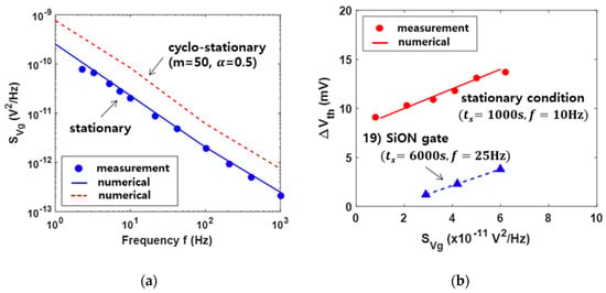 1/f noise spectrum and threshold voltage shifts for . (a) for , (b) versus for .